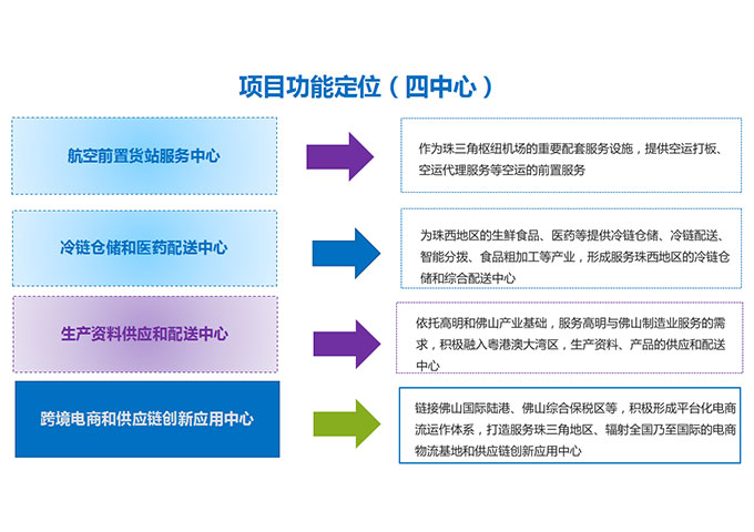项目以“新机场新格局新视角”为策划原点,锚定三大定位:高明临空物流产业高地、大湾区供应链服务基地、国家重要物流供应链节点,与佛山国际陆港形成“空陆联运”双枢纽联动。四大功能中心直指产业痛点:航空前置货站服务中心作为机场配套,提供空运打板等前置服务;冷链仓储和医药配送中心覆盖珠西地区生鲜医药全冷链需求;生产资料供应和配送中心服务佛山制造业供应链;跨境电商中心联动综合保税区,构建平台化电商物流体系。项目深度契合国家“双循环”战略、粤港澳大湾区建设及物流高质量发展政策,是佛山融入全球价值链的关键节点。